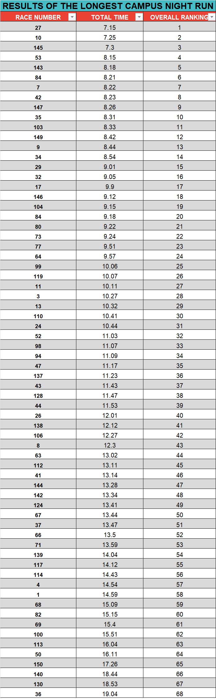 Below, we present the results of the athletes who participated in the Longest Night Run.